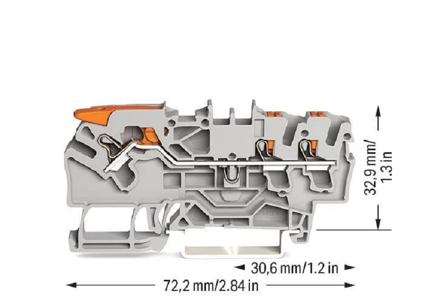 3-conductor through terminal block; with lever and push-button; 2.5 mm²; with test port; side and center marking; for DIN-rail 35 x 15 and 35 x 7.5; Push-in CAGE CLAMP®; 2,50 mm²; gray.